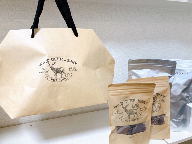 合計4点6500円が5000円‼️ オリジナル紙bag付き✨ 内容 鹿パリパリジャーキー160g✖️2 鹿っちゃジャーキー40g✖️1 鹿パリパリジャーキー40g✖️1 (通常の40g入り商品は他の種類にも変更できます。備考欄にコメントください)