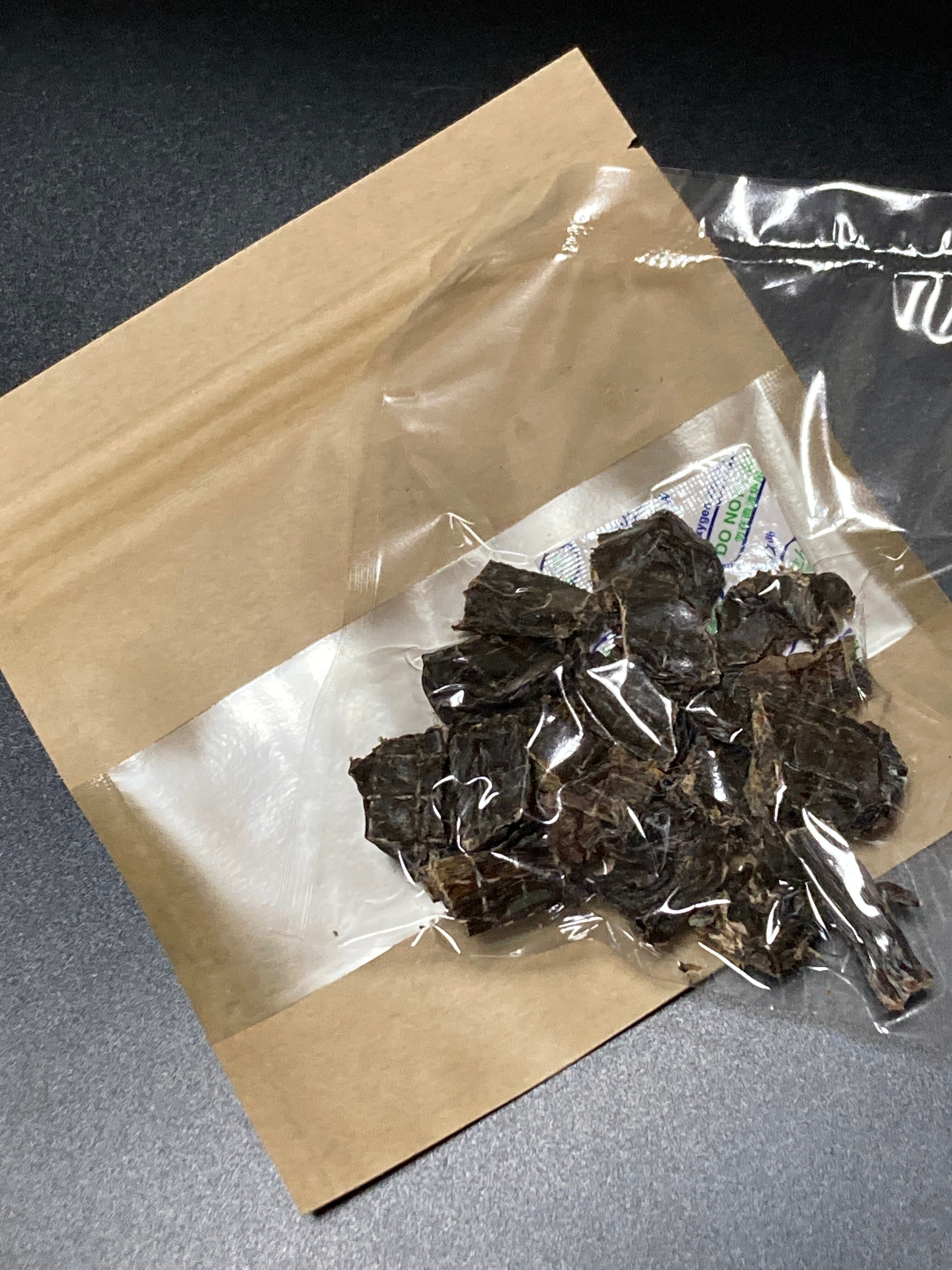 1頭から1つだけしかとれない希少な鹿の心臓をジャーキーにし、お散歩でもあげやすい一口サイズにカットしました(20g入り)